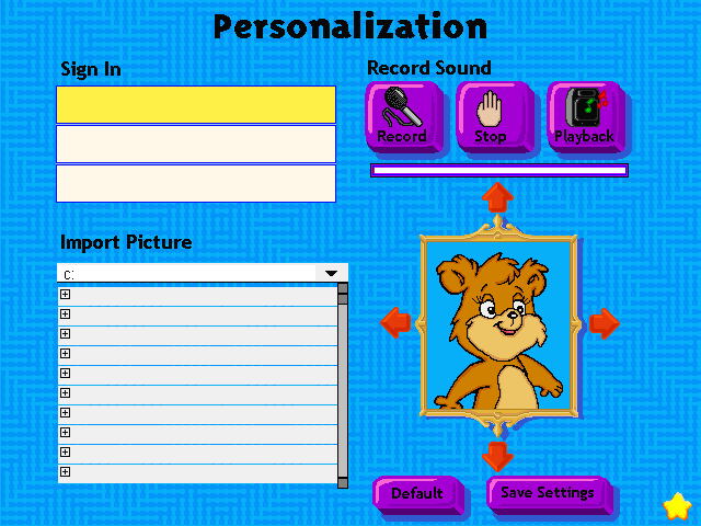 The profile picture by default is Baby Bear, however the image can be changed to any file with a BMP file format. The image can be repositioned with arrows that move it horizontally or vertically. The image cannot be zoomed in and out.